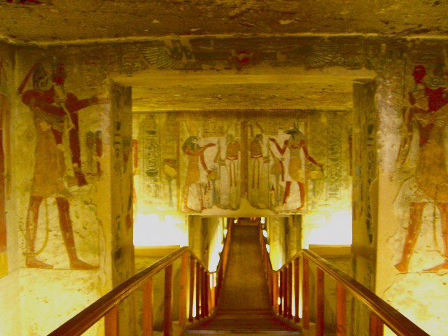Ramses IX (KV6) | This is a large tomb built in the Twentieth Dynasty and runs 105 meters into the hillside. It has a shallow descending ramp that leads to two corridors that have four side chambers each, but none are finished. At the end of the corridor, there are three chambers, one is decorated with the Opening of the Mouth ritual, and the second chamber with four large columns is not decorated. The burial chamber has a vaulted ceiling and is decorated with images of the sky goddess Nut. The far wall has an image of Ramses on a boat surrounded by gods. The yellows, dark blues, and blacks used to decorate this chamber make it unusual in the KV. It was used as a Coptic Church for a short time, so look for the Coptic graffiti on the walls.